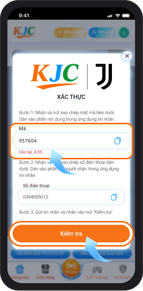 Bước 3: Dùng SĐT đăng ký tài khoản gửi tin SMS đến SĐT hệ thông cung cấp cước phí miễn phí. Nội dung tin nhắn là mã xác thực 6 số điền mã xác thực đó và ấn “Kiểm Tra”.